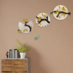 Birds sit on branches of metal wall plates.