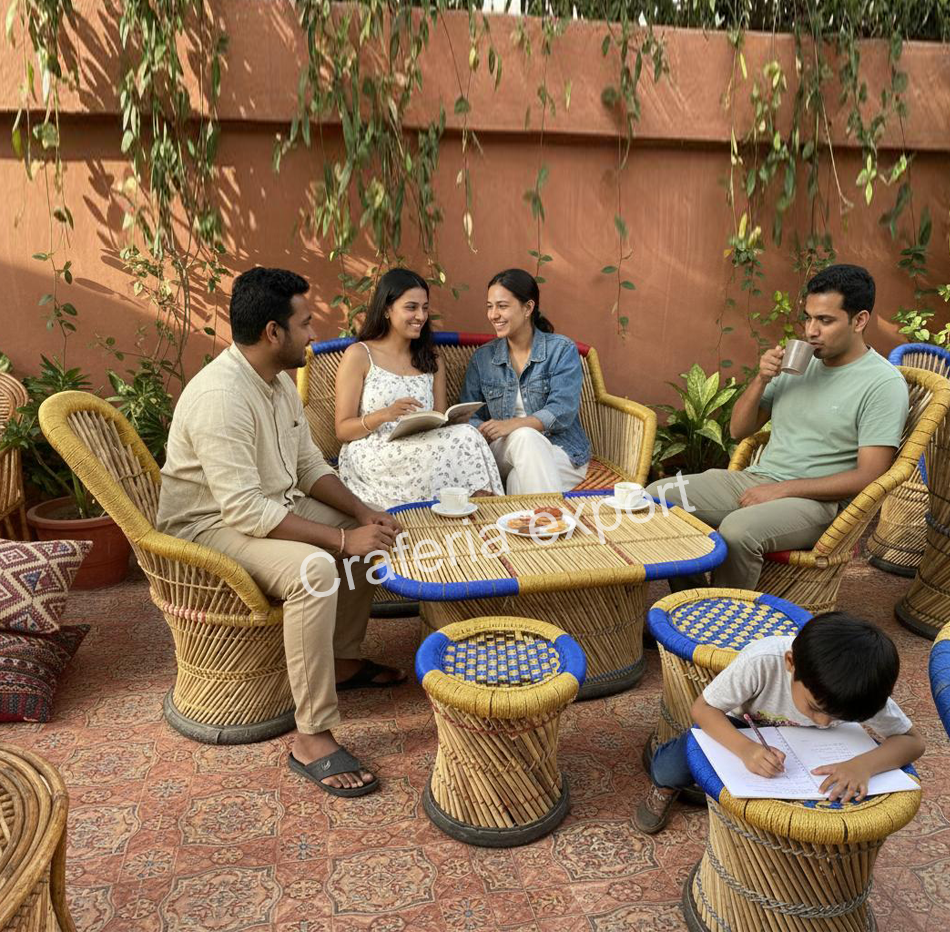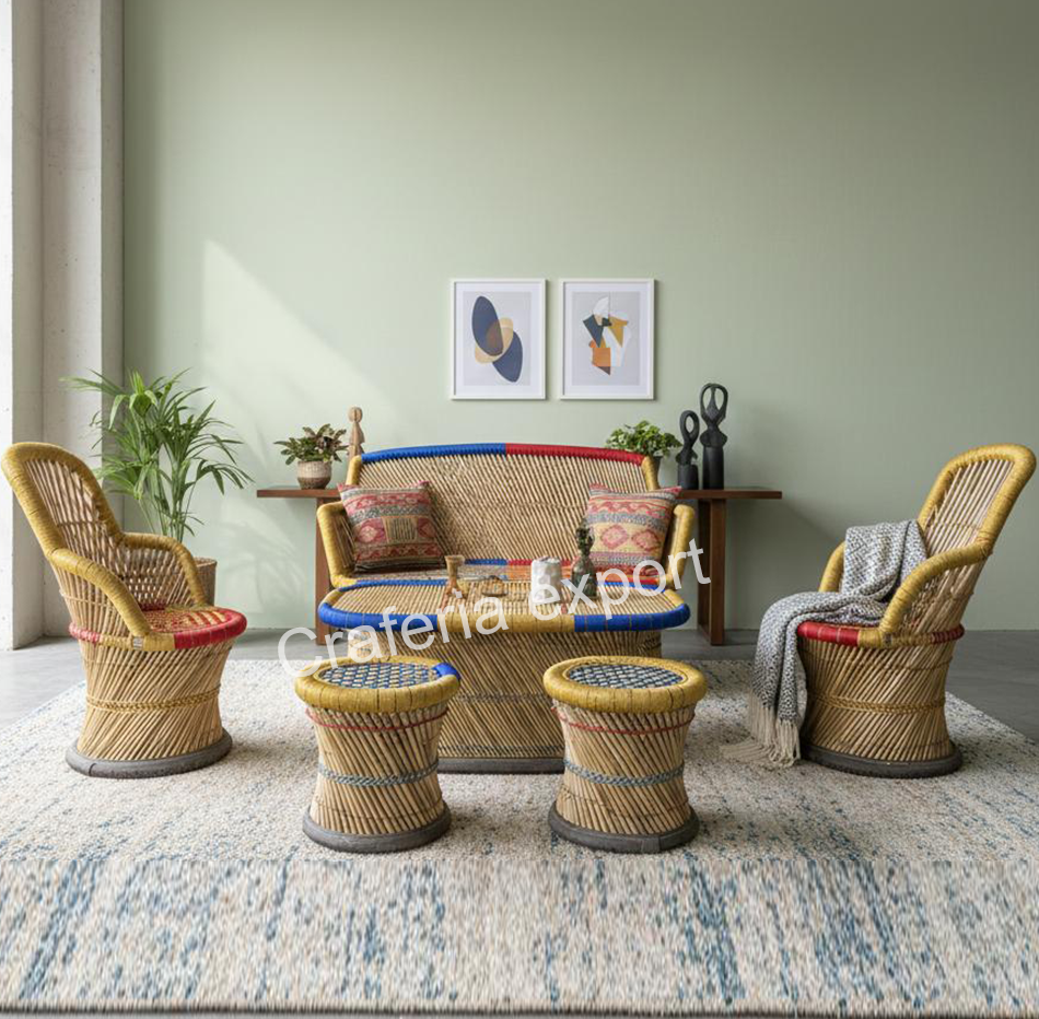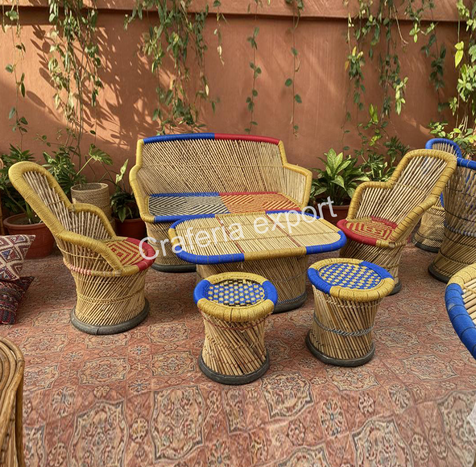 - Complete Furniture Set – Includes colourful bamboo three seater sofa, sofa chairs, center table, and traditional mudda stools.