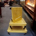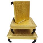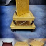 - Exquisite Golden Wooden Chowki Set with Brass Meenakari Work, a true artistic masterpiece that will elevate the beauty of your space.